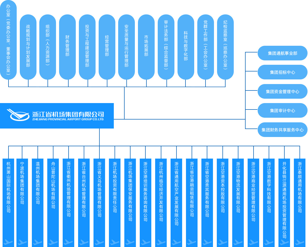 浙江省機場集團有限公司是省級綜合交通投資、建設、運營和管理平臺,根據省委、省政府關于整合全省機場資源、搭建航空大平臺的決策部署,2017年11月17日揭牌成立,時任浙江省委書記車俊、省長袁家軍共同揭牌。集團注冊資本金100億元,下轄杭州機場、寧波機場、溫州機場、舟山機場,托管衢州機場、臺州機場、義烏機場、建德千島湖通用機場等。